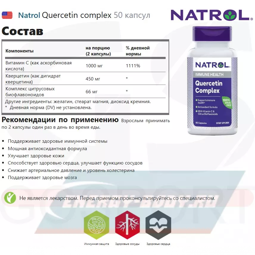 Мощное сочетание кверцетина (500 мг), высокоэффективного витамина C (1000 мг) и комплекса цитрусовых биофлавоноидов (66 мг). Кверцетин: флавоноид растительного происхождения, который содержится во многих фруктах и овощах. Биофлавоноиды усиливают действие витамина С