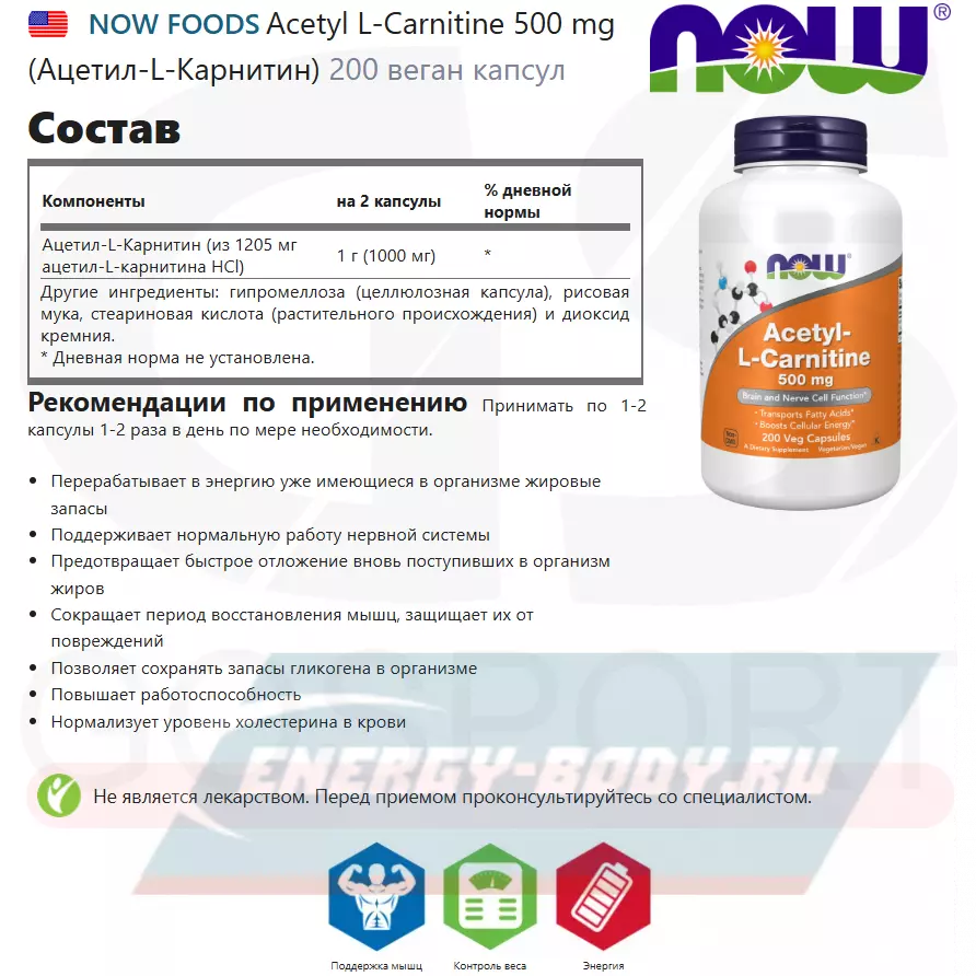NOW® Acetyl-L-Carnitine 500mg – Ацетил-L-Карнитин – питательный элемент, от которого зависит выработка ряда биоактивных соединений с уникальными свойствами для поддержания здоровья человека: