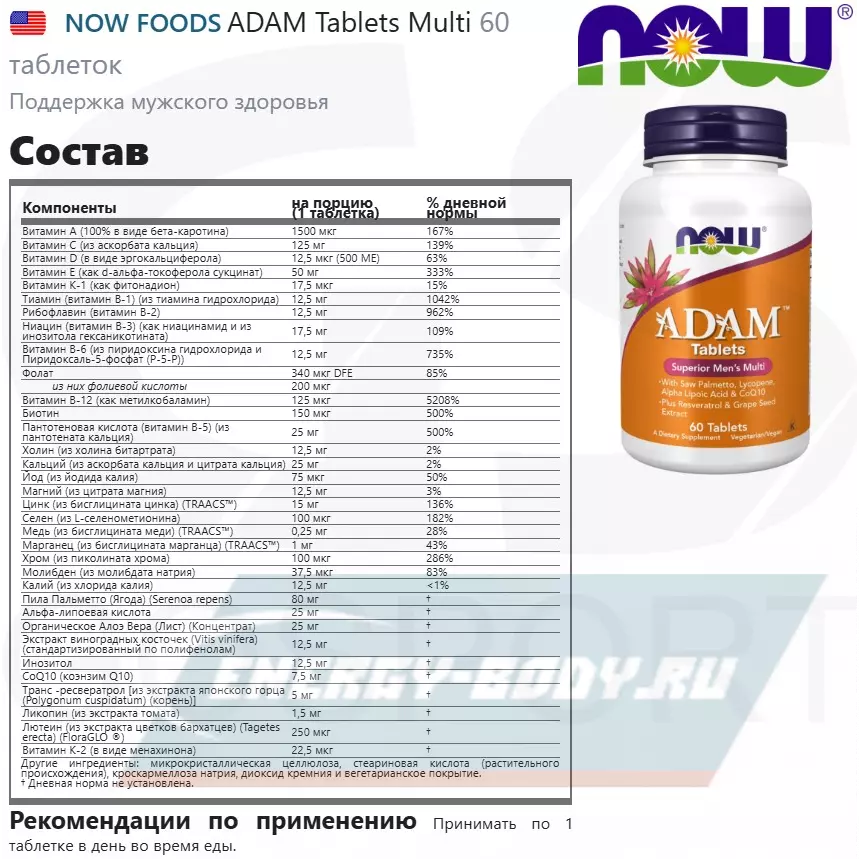 Формула Adam – это инновационная формула, превосходящая все ваши ожидания от мужских комплексов витaминов и минералов для мужчин. Данные витамины – это сочетание микроэлементов и питательных веществ, способствующих выведению токсинов и радикалов, повышению усвоения продукта.