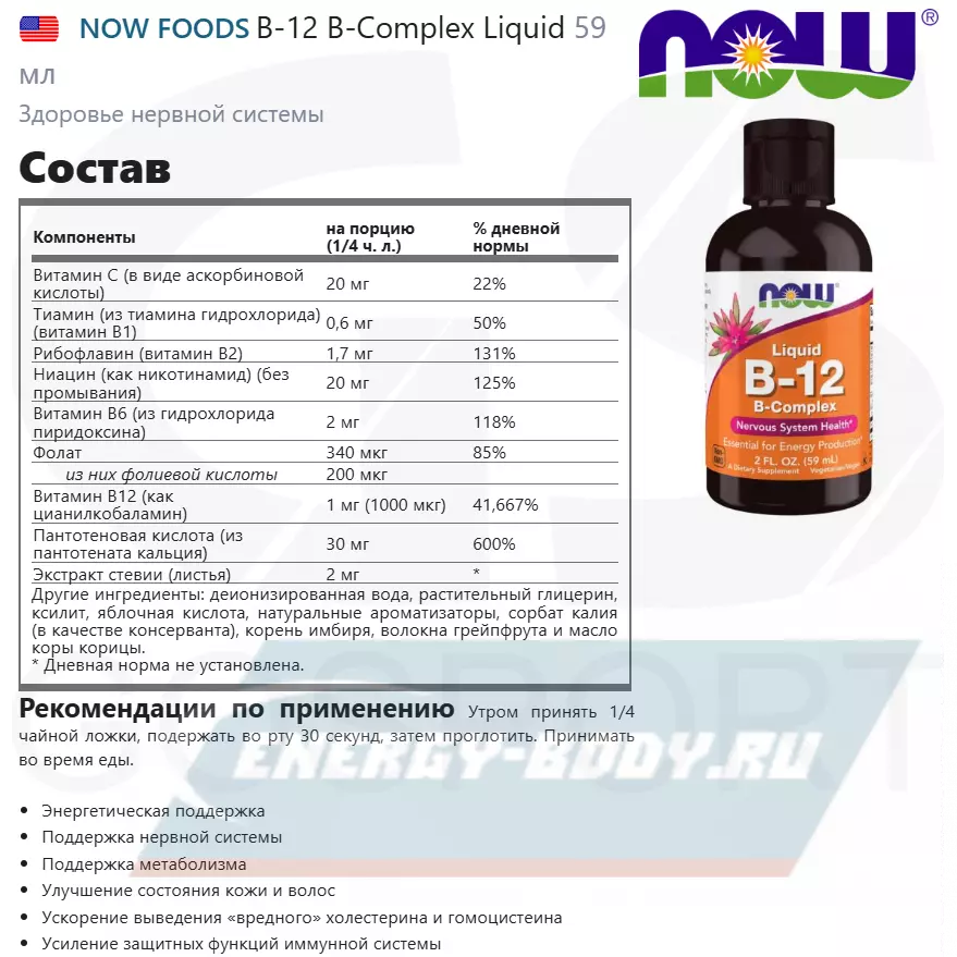 Состав NOW FOODS B-12 B-Complex Liquid