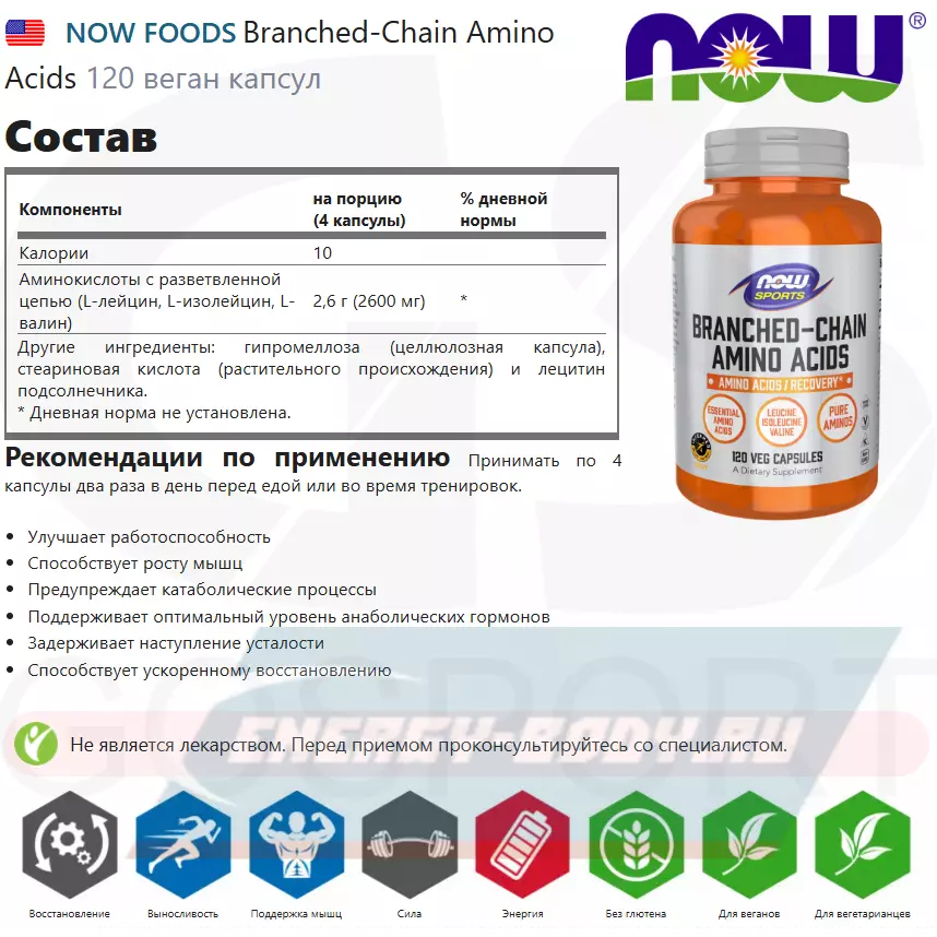 Каждая порция NOW Sports Branched Chain Amino Acids поставляет аминокислоты с разветвленными цепочками (BCAA) в соотношении: 1600 мг лейцина, 650 мг изолейцина и 650 мг валина. Данные аминокислоты очень важны для любого атлета, поскольку выполняют ряд функций: способствуют улучшению работоспособности и выносливости и росту мышечной массы, предупреждают ее распад и задерживают наступление усталости.