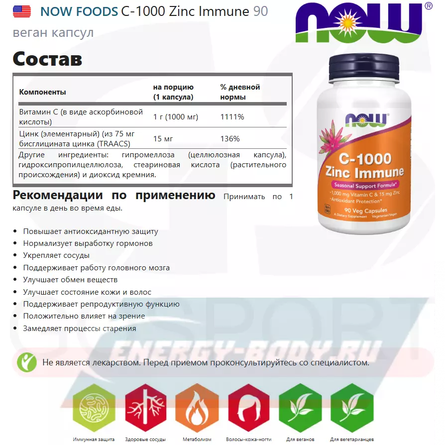 C-1000 Zinc Immune от NOW – это комплекс из двух веществ в наиболее качественных и биодоступных формах, которые имеют синергетическое воздействие на иммунитет и защитные функции организма. Витамин С необходим для поддержания основных свойств иммунной защиты, противодействия воспалительным процессам и защите клеток от оксидативного стресса. Витамин С влияет на работу почти всех систем и тканей, а также участвует в выработке многих ферментов и других важных биохимических реакциях. Также витамин улучшает здоровье кожи, устраняет накожные дефекты и воспалительные процессы, способствует омоложению эпидермиса.