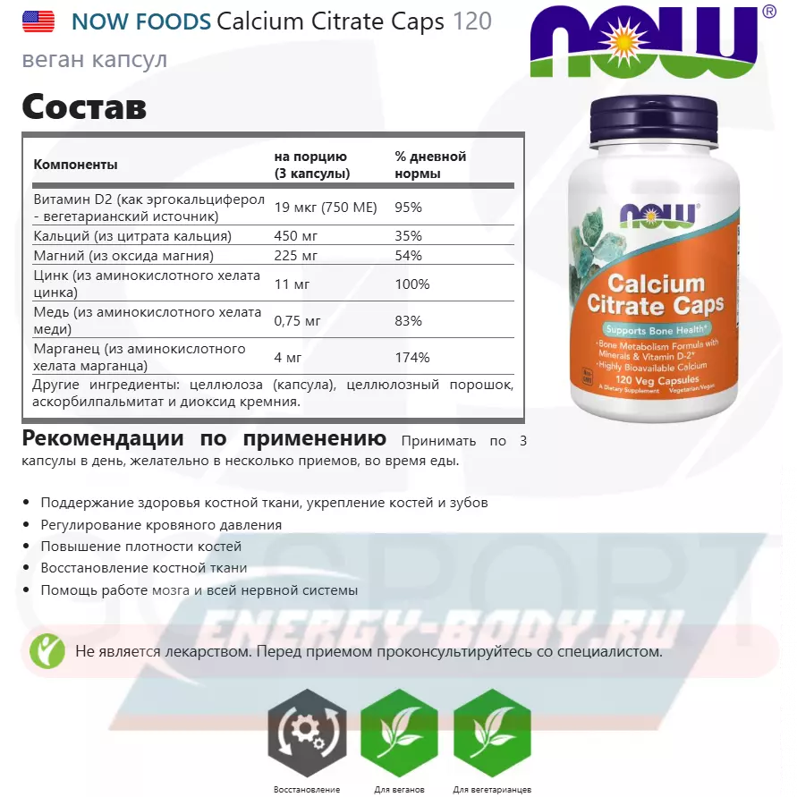 Повышайте крепость костей и зубов за счет приема кальция в составе Calcium Citrate Caps от NOW. Особенность добавки заключается в содержании высоко биодоступной формы кальция из цитрата кальция и содержания ряда минералов и витамина Д2 для получения максимального результата от применения.