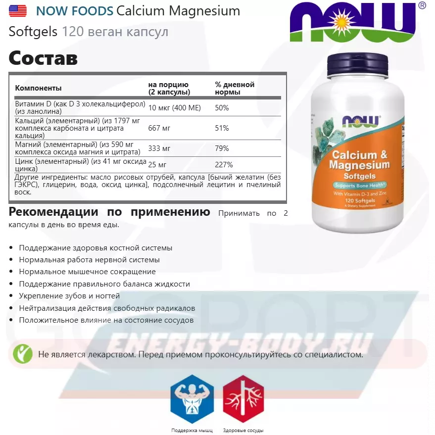 Комплекс Calcium Magnesium Softgels от NOW содержит кальций и магний в соотношении 2:1 для их оптимального усвоения, а также цинк и витамин Д3. С таким набором компонентов вы сможете укрепить кости и зубы. Помимо этого, кальций и магний улучшат работу нервной системы, а также поддержат нормальное мышечное сокращение, в том числе работу сердечной мышцы. Данные минералы необходимы также для нормального кровяного давления.