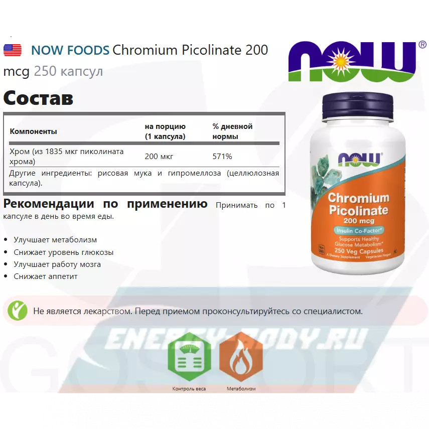 Состав NOW FOODS Chromium Picolinate 200 mcg
