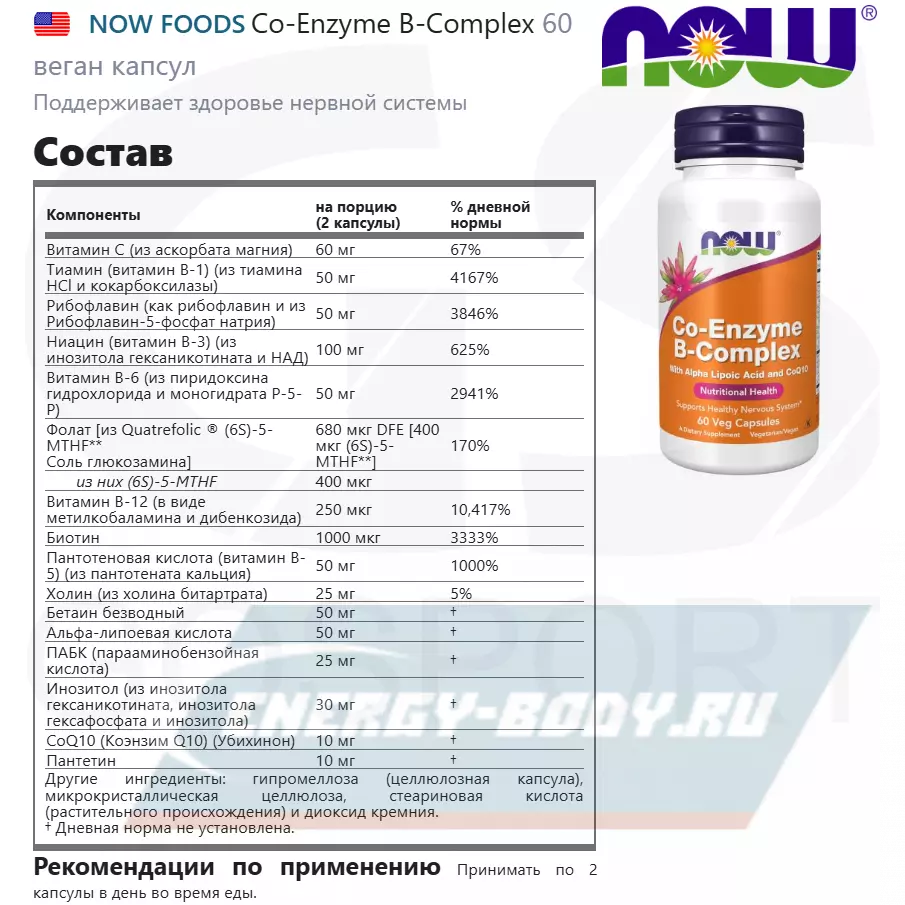 NOW Co-Enzyme B-Complex рекомендуется принимать по 2 капсулы в день во время еды.