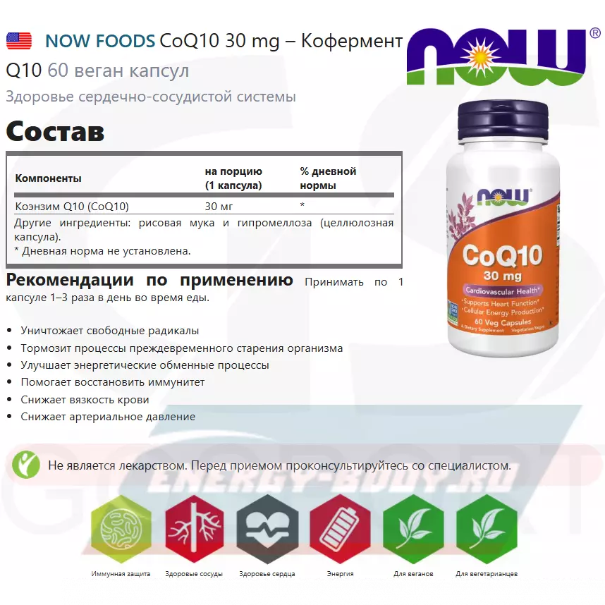 NOW FOODS CoQ10 30 mg – Кофермент Q10 60 веган капсул — Здоровье сердечно-сосудистой системы