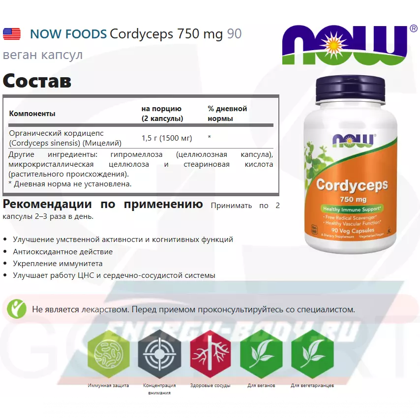 Витамины NOW Foods Кордицепс обладают следующими полезными свойствами: