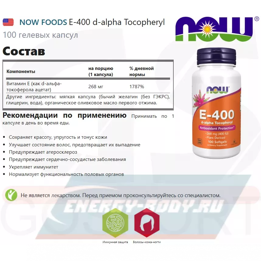 Состав NOW FOODS E-400 D-Alpha Tocopheryl