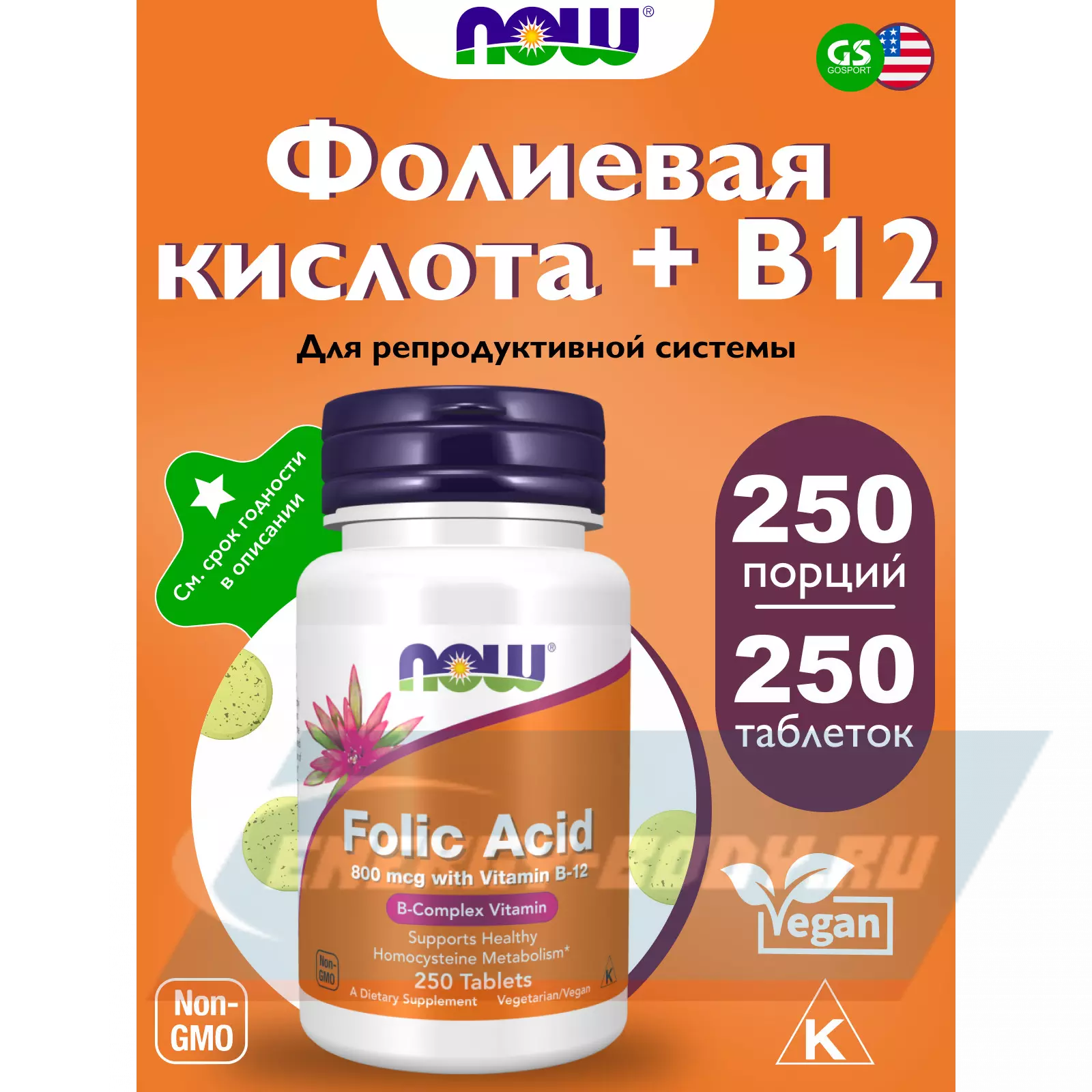 Состав NOW FOODS Folic Acid 800 mcg + B-12 (Cyanocobalamin) 25 mcg