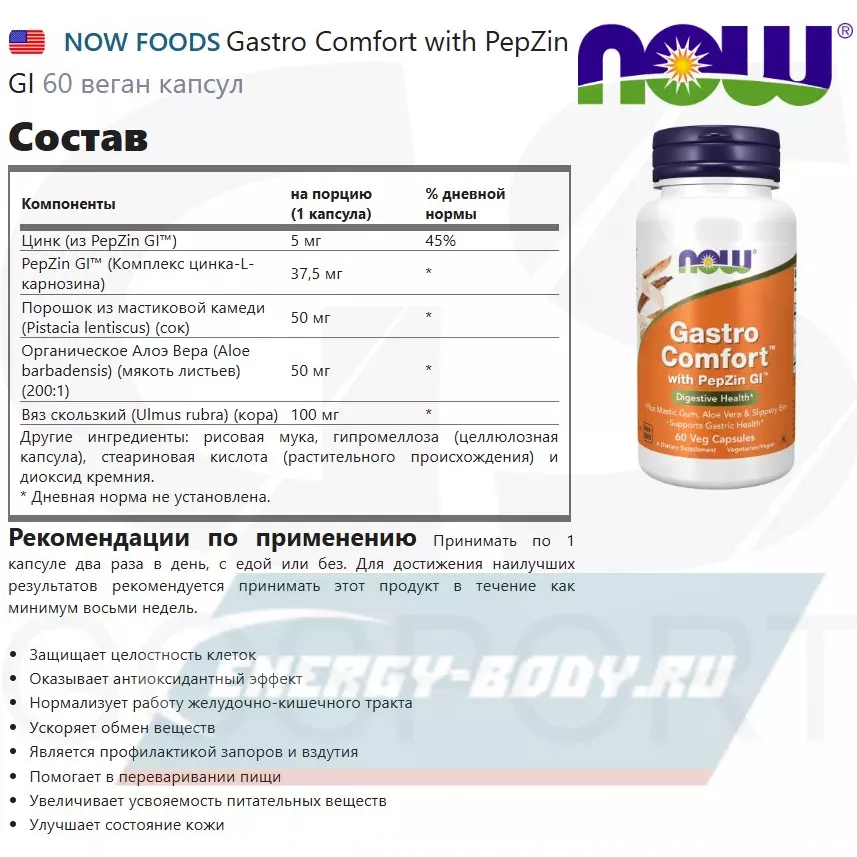 NOW FOODS Gastro Comfort with PepZin GI обладает следующими полезными свойствами: