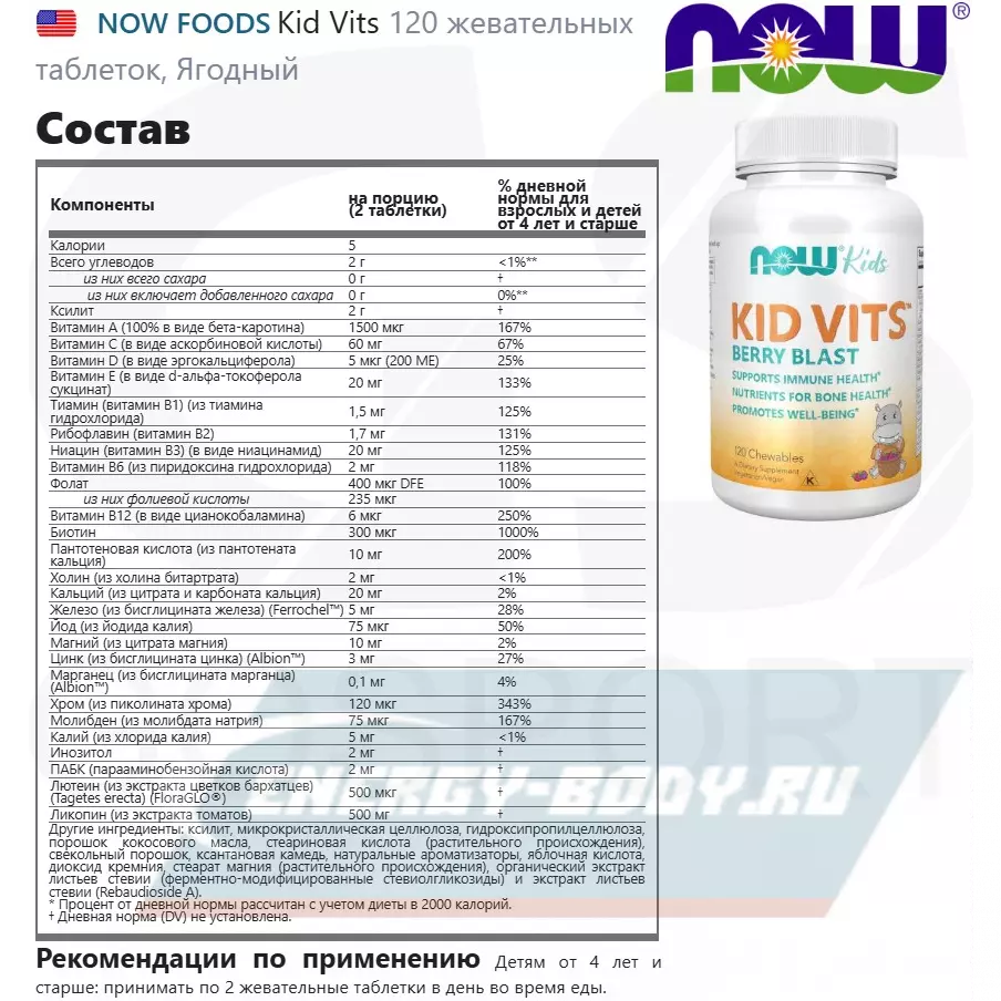 Детские мультивитамины NOW «Ягодный взрыв» рекомендованы к применению детям с 4-х лет.