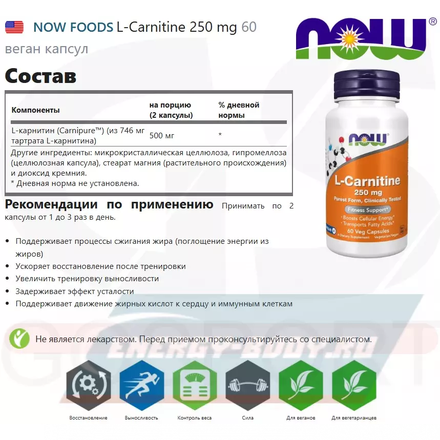 Состав NOW FOODS L-Carnitine 250 mg