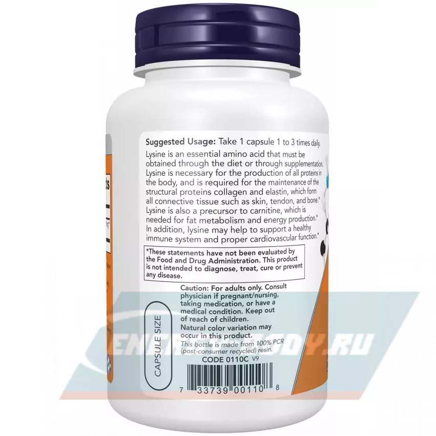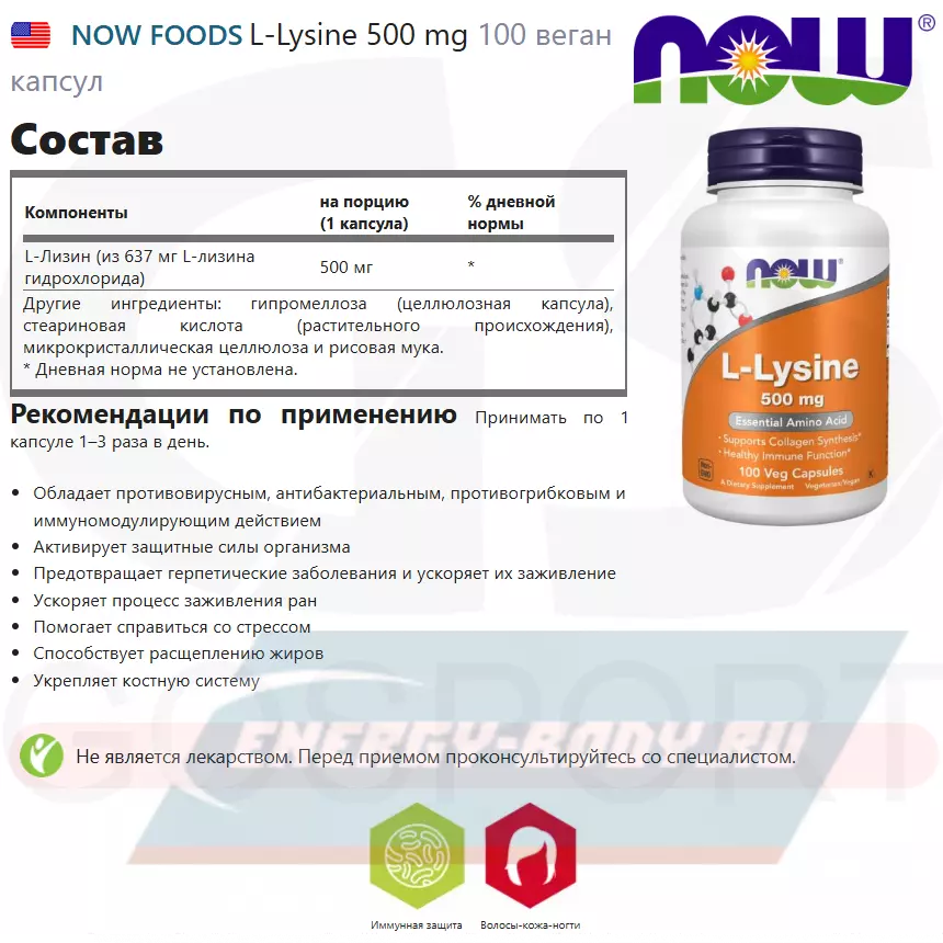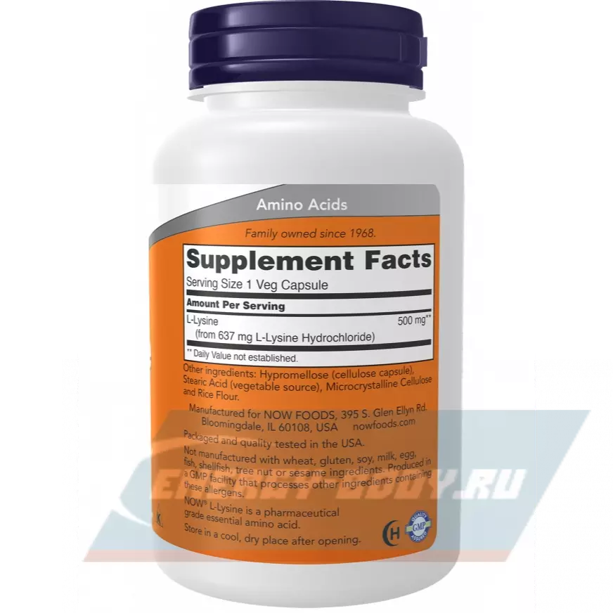 L-лизин от Now — незаменимая аминокислота фармацевтической степени чистоты.