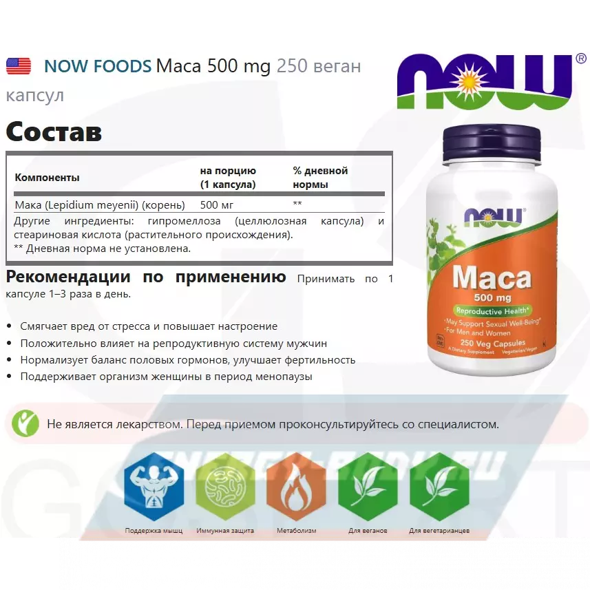Для улучшения половой функции как у мужчин, так и у женщин, используют препарат NOW Maca 500 mg. Эту биоактивную добавку производит американская компания в соответствии с требованиями действующего стандарта качества GMP. Так как препарат разработан исключительно на натуральной растительной основе, его могут включать в рацион вегетарианцы и строгие веганы. Добавка «Перуанская мака» 500 мг 100 капсул хорошо усваивается организмом, не вызывает при этом привыкания или каких-либо побочных эффектов.