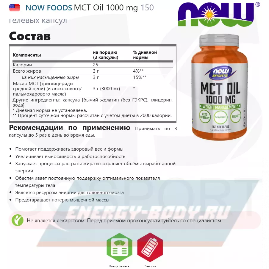 MCT Oil – уникальный тип жиров, которые оказывают целый комплекс полезных воздействий для людей, чьё тело регулярно испытывает интенсивные физические нагрузки. Этот продукт был разработан американской фирмой NOW Foods, которая специализируется на производстве биологически активных добавок (БАД), комплексов витаминов и минералов, косметических средств на основе натуральных компонентов. БАД NOW FOODS MCT Oil 1000 mg рекомендован для включения в спортивное питание с целью повысить работоспособность, активизировать синтез гормона роста, снизить количество жировых отложений.