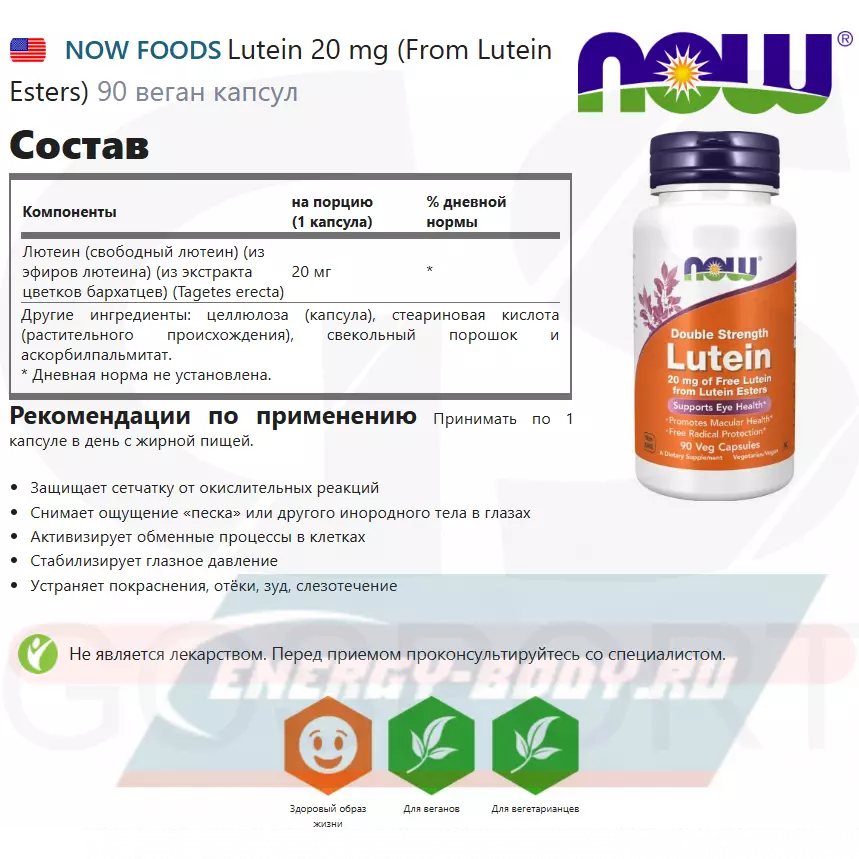 При этом важно помнить, что добавка NOW FOODS Lutein 20 mg не является панацеей от всех заболеваний – это не лекарство. Она используется только для обогащения рациона в профилактических целях или в составе комплексной терапии.