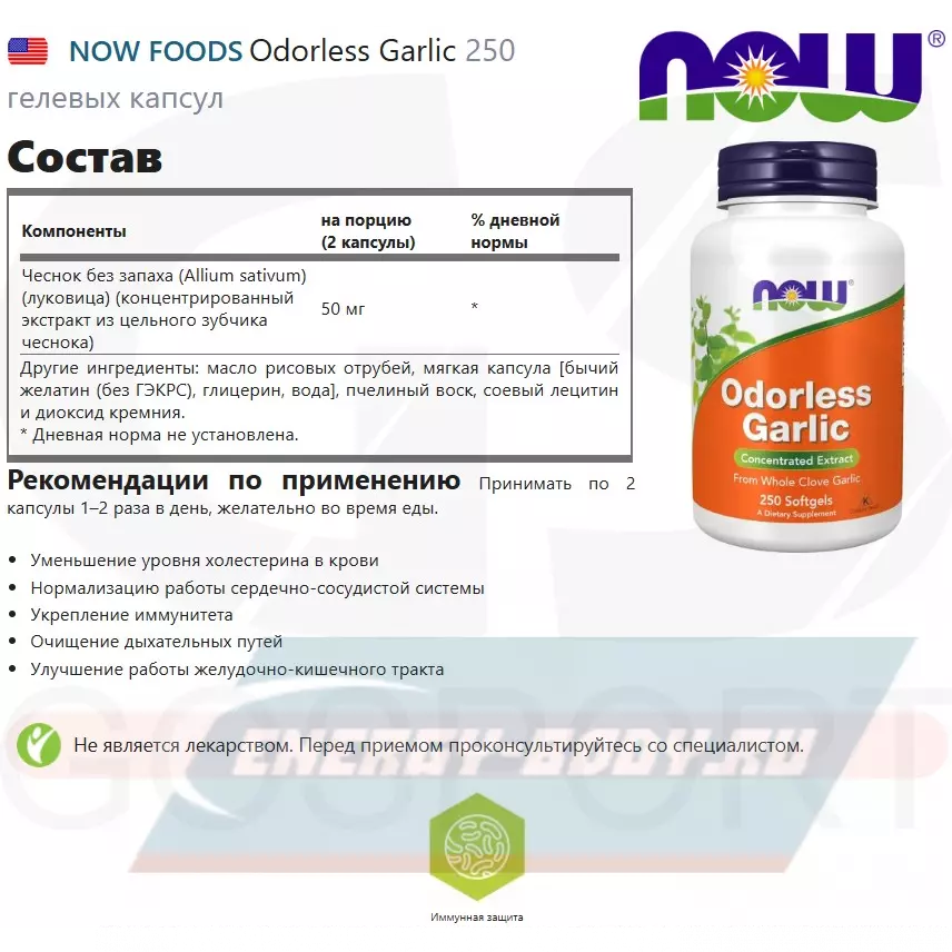 Биологически активная добавка от компании NOW Foods содержит в себе экстракт чеснока, который не обладает резким запахом и не оказывает негативного воздействия на желудочно-кишечный тракт. Несмотря на обработку чеснока, он сохраняет в себе все полезные свойства.
