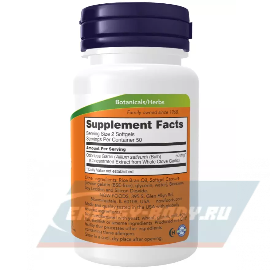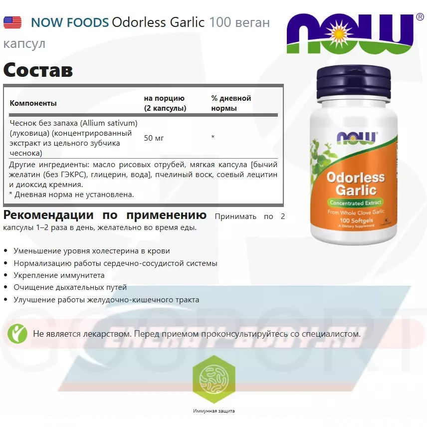 Биологически активная добавка от компании NOW Foods содержит в себе экстракт чеснока, который не обладает резким запахом и не оказывает негативного воздействия на желудочно-кишечный тракт. Несмотря на обработку чеснока, он сохраняет в себе все полезные свойства.