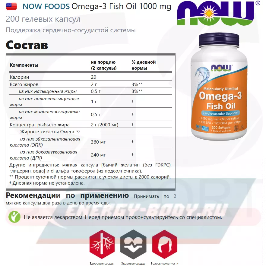 БАД «Омега-3» (Now, 200 капсул) помогает: