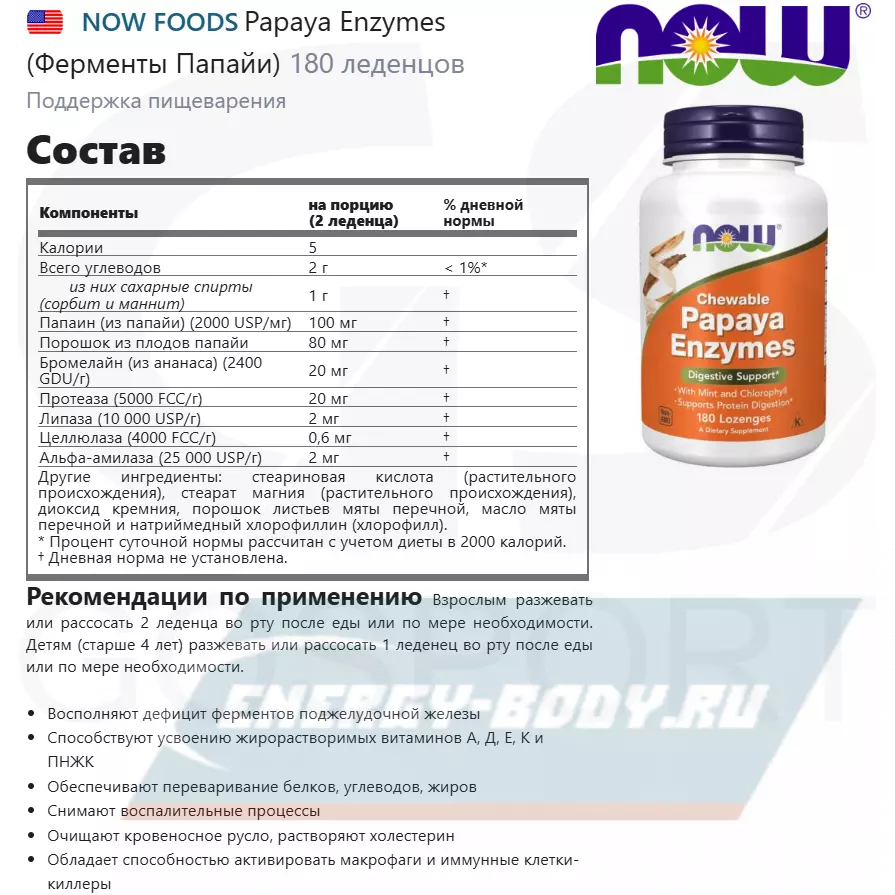 Состав NOW FOODS Papaya Enzymes (Ферменты Папайи)