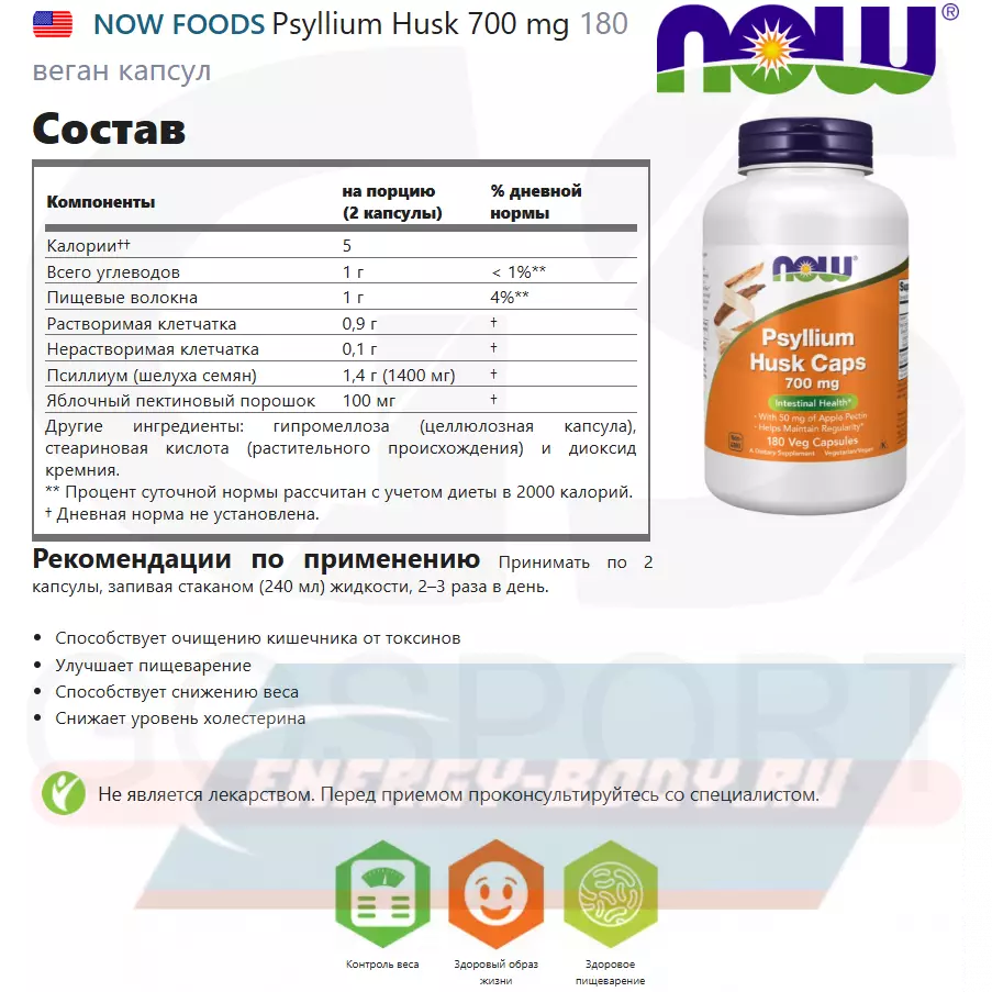 NOW FOODS Psyllium Husk 700 mg 180 веган капсул — Для пищеварения и очищения кишечника