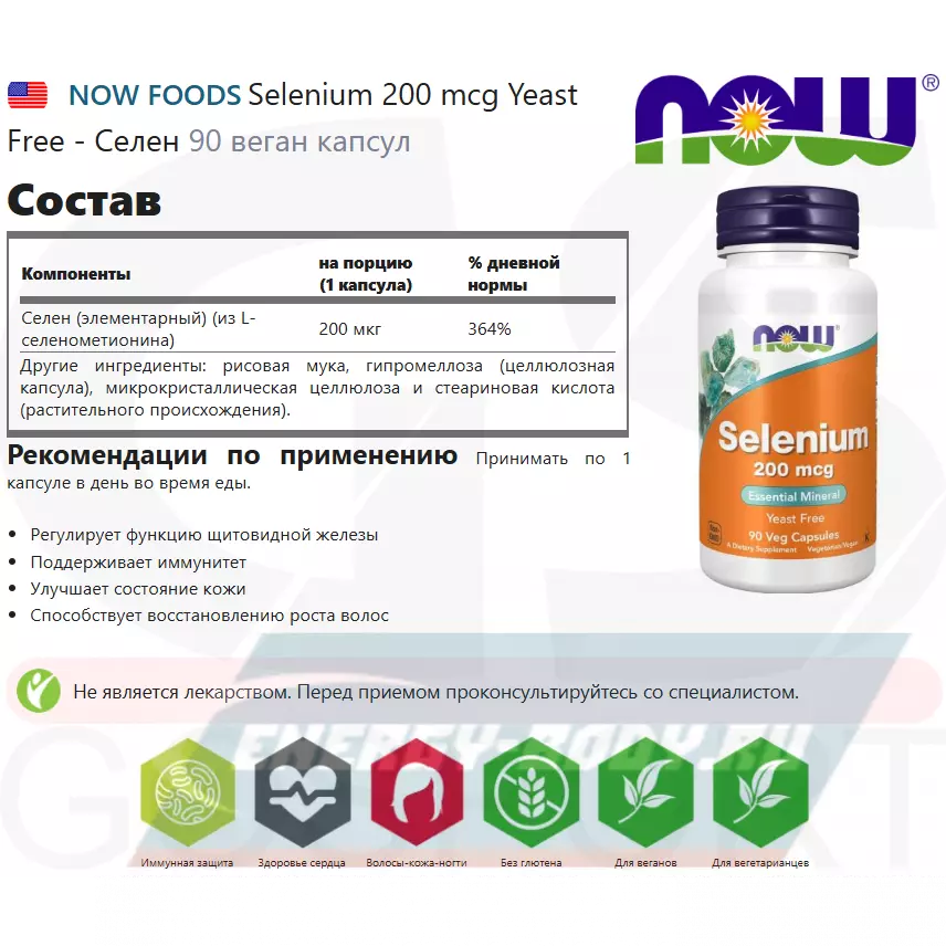 В активную формулу биодобавки входит селен – незаменимый микроэлемент для нормальной жизнедеятельности человека. Его добывают путём переработки бразильского ореха, субпродуктов, морепродуктов и ростков пшеницы. Одна целлюлозная капсула БАДа Selenium содержит 200 mcg селена, а также рисовую муку и стеариновую кислоту растительного происхождения. В формуле добавки отсутствуют канцерогены, глютен, соя, генетически модифицированные вещества, а также гидрогенизированные жиры. Состав БАДа Now Foods официально соответствует стандарту GMP.