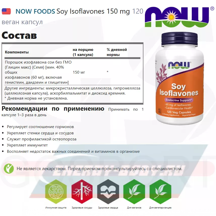NOW FOODS Soy Isoflavones противопоказаны при индивидуальной непереносимости компонентов. Беременным и кормящим необходима консультация врача.