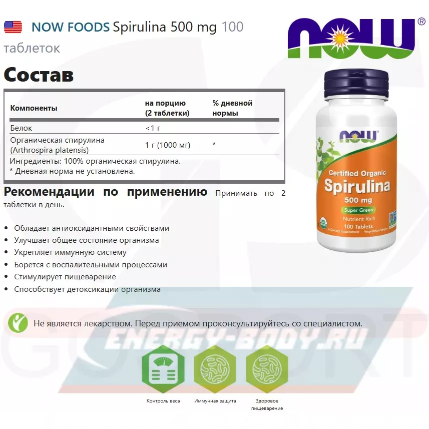 Особенности состава и для чего нужен Spirulina 500 мг от NOW?