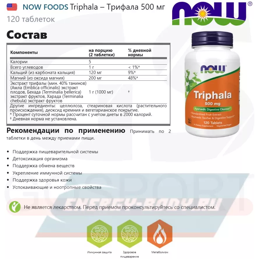 Состав NOW FOODS Triphala – Трифала 500 мг