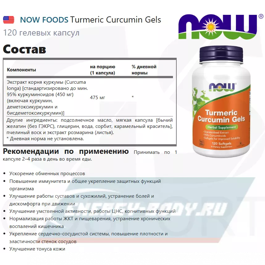 Now Foods Turmeric Curcumin Gels – это мощная добавка на основе куркумина, главного активного компонента куркумы, обладающая сильными антиоксидантными и противовоспалительными свойствами. Эта добавка является высокоэффективным средством для поддержания здоровья суставов, борьбы со стрессом, улучшения пищеварения и защиты клеток организма от повреждений.
