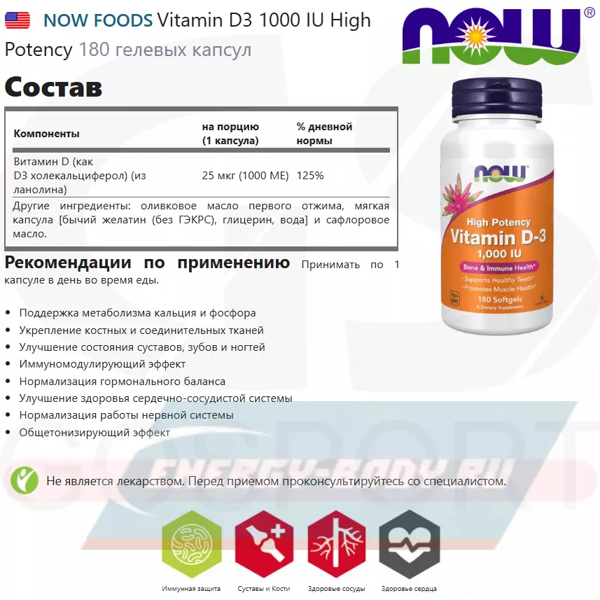 Vitamin D-3 содержит в одной капсуле 1000 МЕ активного вещества. Эта пищевая добавка используется для обогащения рациона с целью поддержания здоровья иммунной системы и прочности костной ткани.