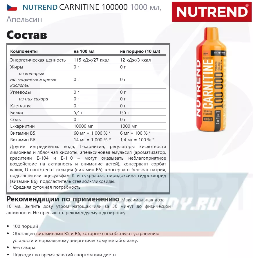 Другие ингредиенты: вода, L-карнитин, регуляторы кислотности лимонная и яблочная кислоты, апельсиновая эмульсия (ароматизатор, красители Е-104 и Е-110 – могут оказывать неблагоприятное воздействие на активность и внимание детей), консервант сорбат калия, D-пантотенат кальция (витамин В5), консервант бензоат натрия, подсластители ацесульфам К и сукралоза, пиридоксина гидрохлорид (витамин В6), подсластитель стевиол-гликозиды.