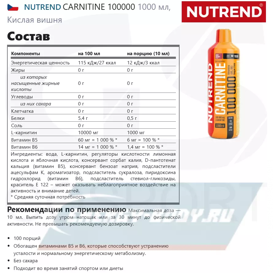 Карнитин 100 000 является одним из продуктов с самым высоким содержанием жидкой основы карнитина на рынке. Карнитин – это вещество, которое естественным образом встречается в организме, которое организм может синтезировать из аминокислот L-лизина, L-метионина и L-глицина в присутствии витамина С, витамина В6 и железа. Только низкий уровень некоторых из этих веществ может сделать синтез карнитина недостаточным. Благодаря этому карнитин особенно полезен во время диет, но также в моменты усталости и умственного истощения. При нормальных обстоятельствах доза 10 мл этого концентрата должна быть достаточной.