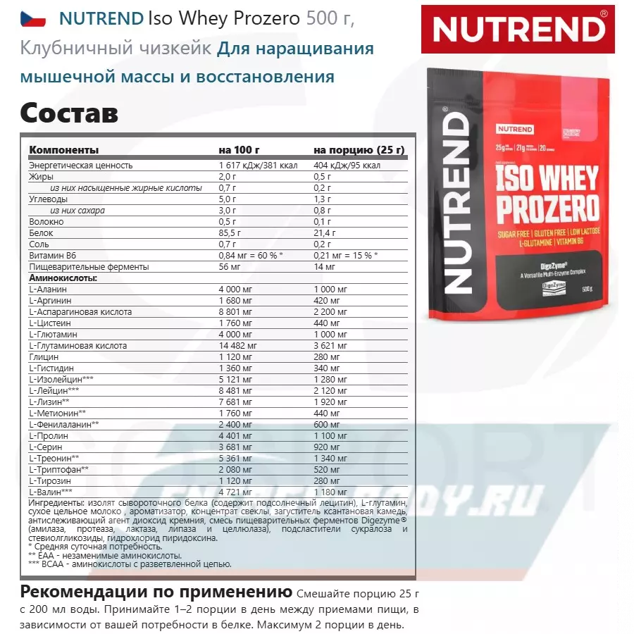 Nutrend Iso Whey ProZero - это новейший продукт в линейке белков, произведенных методом CFM. Использование изолированного сывороточного протеина гарантирует максимальное качество, а также является одним из лучших источников незаменимых аминокислот и естественного высокого уровня BCAA . Этот продукт был разработан с учетом строжайших диетических требований ведущих спортсменов и поэтому имеет низкое содержание лактозы и, что самое главное, не содержит следов сахара!