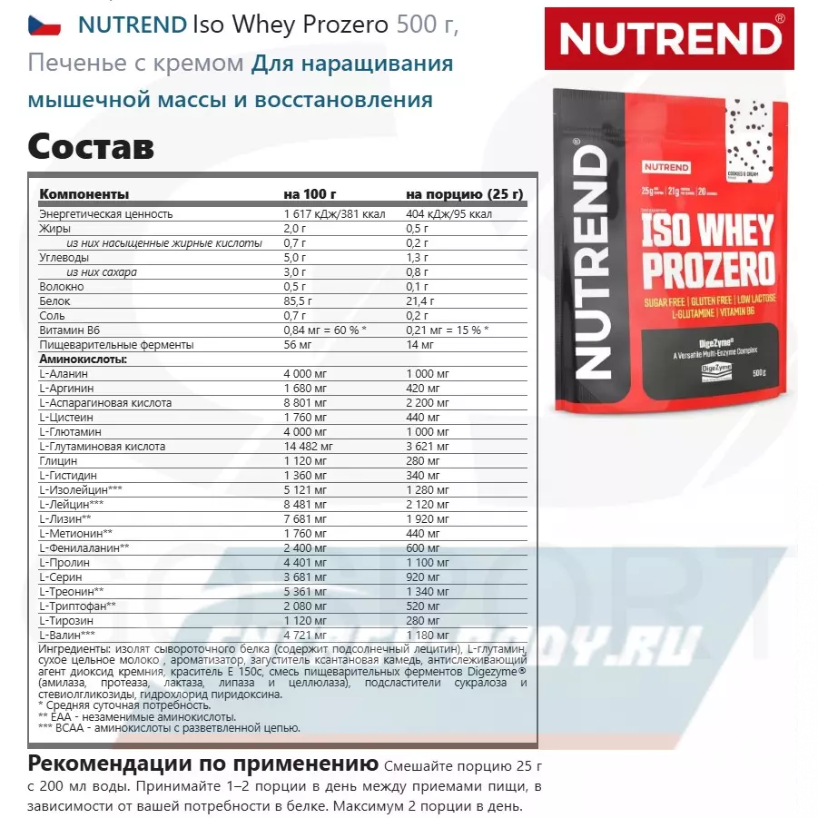 Nutrend Iso Whey ProZero - это новейший продукт в линейке белков, произведенных методом CFM. Использование изолированного сывороточного протеина гарантирует максимальное качество, а также является одним из лучших источников незаменимых аминокислот и естественного высокого уровня BCAA . Этот продукт был разработан с учетом строжайших диетических требований ведущих спортсменов и поэтому имеет низкое содержание лактозы и, что самое главное, не содержит следов сахара!