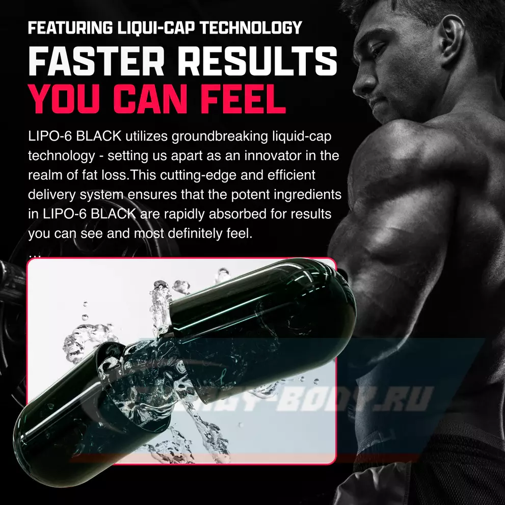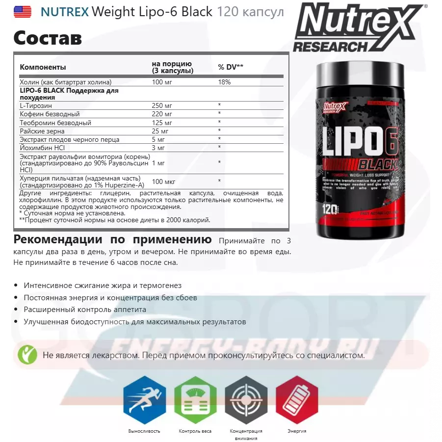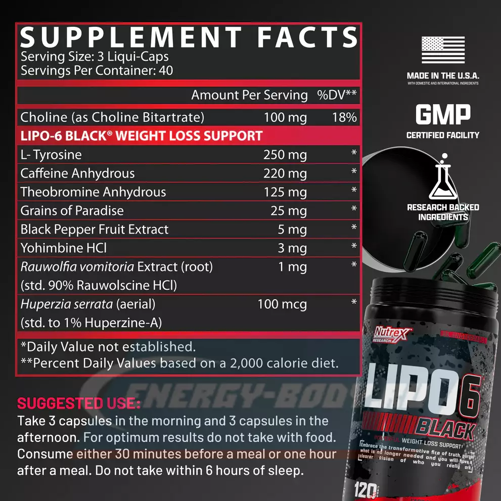 Жиросжигающий комплекс Lipo 6 Black US от Nutrex как источник безводного кофеина, Advantra Z, экстрактов бакопы, йохимбина поможет вам эффективнее сжигать жир и снабжаться при этом топливом для улучшения качества своих тренировок. При этом каждый из компонентов данного спортивного питания вносит свой вклад в избавление вас от лишнего веса.