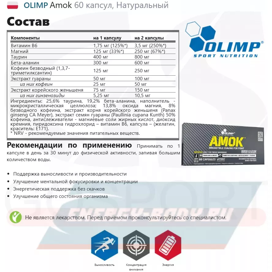 Бета-алланин, таурин, подобранные в оптимальной пропорции, обеспечивают комплексное воздействие на организм. Olimp Amok поддерживает стабильный энергетический обмен между клетками во время высокоинтенсивных нагрузок, благодаря чему ускоряются физиологические процессы и подавляется действие катаболических реакций.