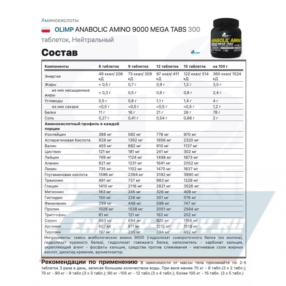 Формула Anabolic Amino 9000 содержит прежде всего набор незаменимых аминокислот для любой диеты. Специалисты «Олимпа» разработали его в качестве добавки, которая обеспечивает оптимальную дозу этих питательных веществ для ежедневного рациона. Как все мы знаем, активные люди имеют повышенную потребность в энергии, должны есть больше, в том числе аминокислоты. Anabolic Amino 9000 содержит большее количество определенных компонентов (например, аргинин, глицин, пролин) для лучших и более стойких результатов. Аминокислоты, используемые в этом препарате, обеспечиваются высококачественными куриными и сывороточными белками, которые гидролизуются для удаления любых добавок или примесей.