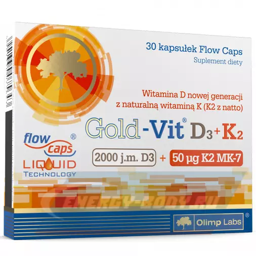 Gold-Vit® D3 + K2 Пищевая добавка в виде жидких капсул Flow Caps, содержащая высокие дозы витамина D (D3) в дозе 4000 МЕ. Продукт также содержит натуральный витамин К из натто, высокоусвояемую и активную форму1 - менахинон-7 (витамин К2).