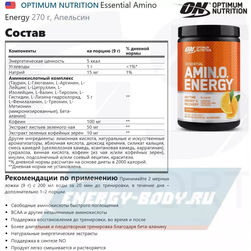 Благодаря аминокислотному составу, состоящему в основном из незаменимых аминокислот, Amino Energy представляет собой отличный анаболический комплекс. Плюс ко всему, такие аминокислоты как BCAA и аргинин, также включенные в состав продукта, помогут вам эффективно нарастить мышечную массу и в значительной степени усилить эффект «пампинга» в тренировочный и пост-тренировочный цикл.
