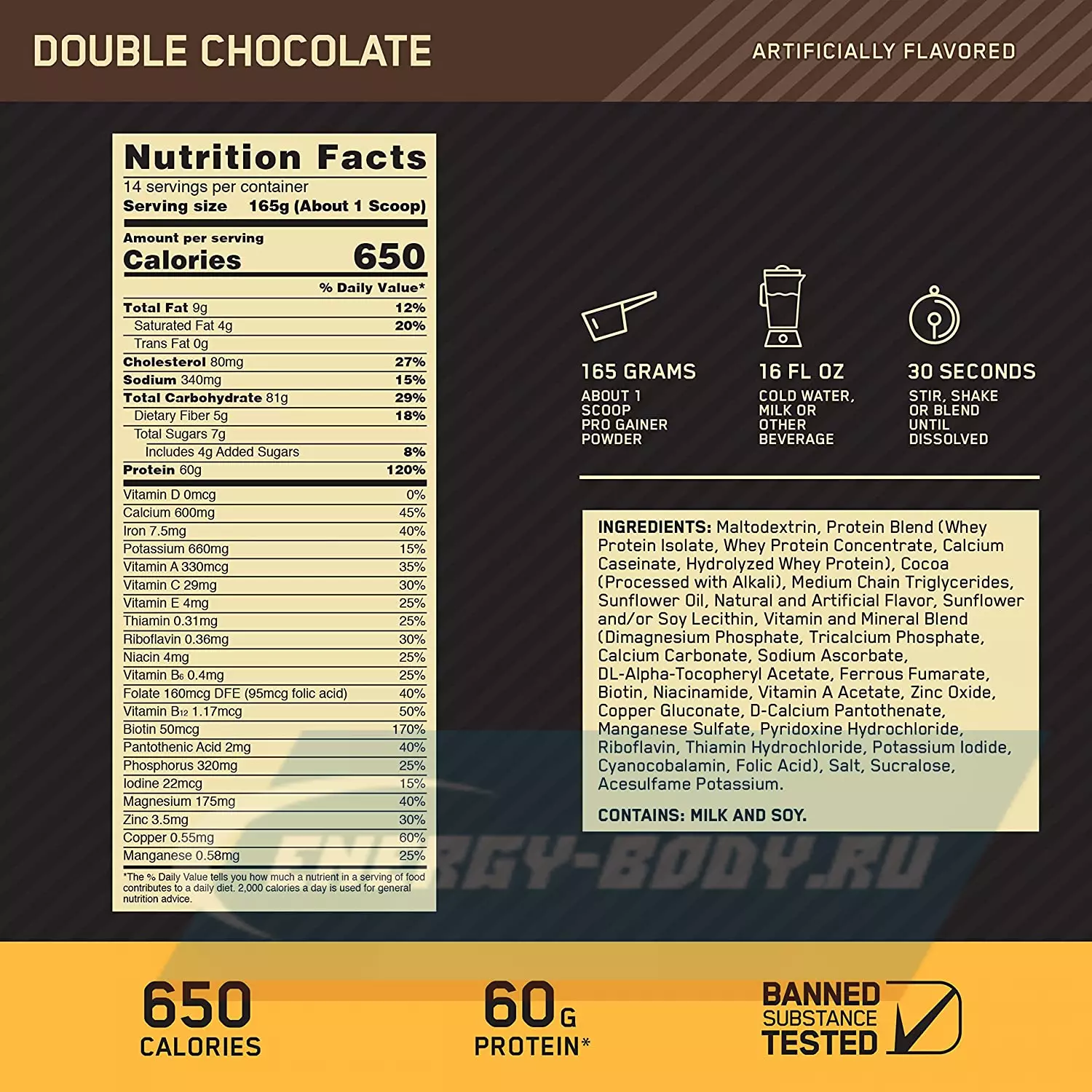 Ингредиенты: Мальтодекстрин, протеиновая смесь (изолят сывороточного протеина, концентрат сывороточного протеина, казеинат кальция, гидролизованный сывороточный протеин), какао (щелочной обработки), триглицериды со средней цепью, подсолнечное масло, натуральные и искусственные ароматизаторы, подсолнечный и/или соевый лецитин, витаминно-минеральная смесь (фосфат димагния, трикальций фосфат, карбонат кальция, аскорбат натрия, DL-альфа-токоферилацетат, фумарат железа, биотин, ниацинамид, ацетат витамина А, оксид цинка, глюконат меди, D-пантотенат кальция, сульфат марганца, гидрохлорид пиридоксина, рибофлавин, гидрохлорид тиамина, йодид калия, цианокобаламин, фолиевая кислота), соль, сукралоза, ацесульфам калия.