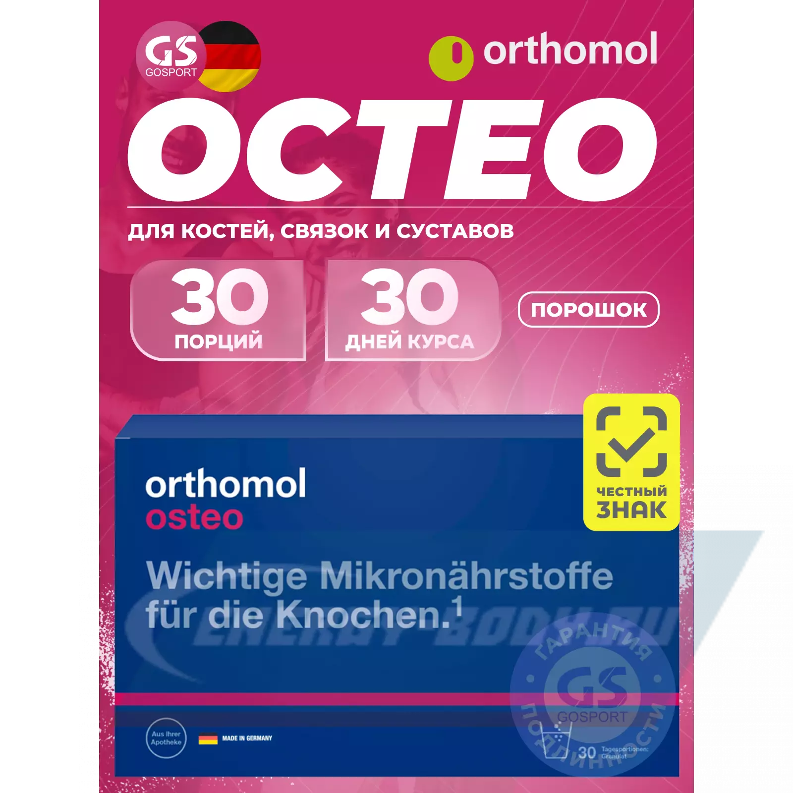 OrthomolOsteo (порошок 30 дн.) – ортомолекулярный препарат, рекомендованный при остепорозе. Микроэлементы, входящие в состав препарата, влияют на всасывание кальция в кишечнике (восполнение кальция в организме), улучшают минерализацию кости.