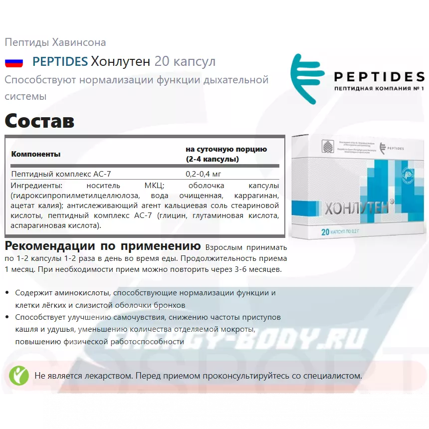 PEPTIDES Хонлутен (Chonluten) 20 капсул — Нормализация функции легких и слизистой оболочки бронхов