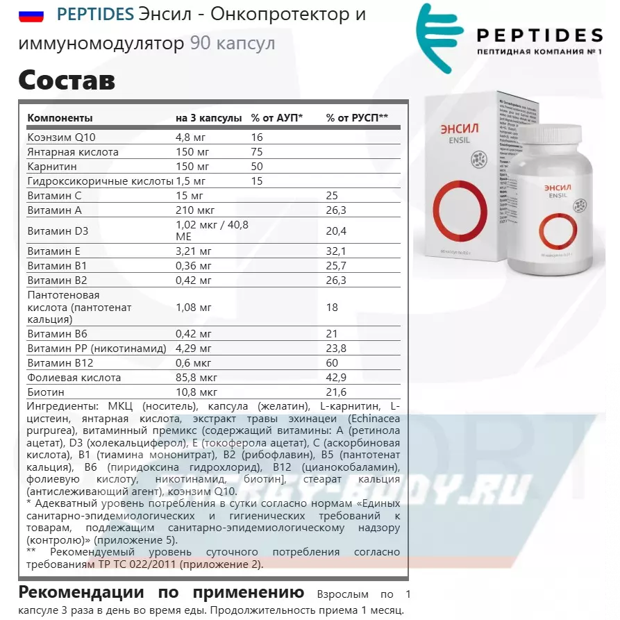 Ингредиенты: МКЦ (носитель), капсула (желатин), L-карнитин, L-цистеин, янтарная кислота, экстракт травы эхинацеи (Echinacea purpurea), витаминный премикс (содержащий витамины: А (ретинола ацетат), D3 (холекальциферол), Е (токоферола ацетат), С (аскорбиновая кислота), В1 (тиамина мононитрат), В2 (рибофлавин), B5 (пантотенат кальция), В6 (пиридоксина гидрохлорид), В12 (цианокобаламин), фолиевую кислоту, никотинамид, биотин], стеарат кальция (антислеживающий агент), коэнзим Q10.