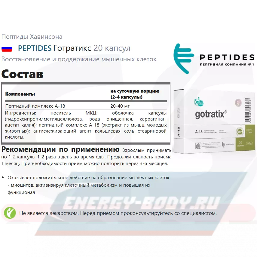 Пептидный комплекс Готратикс N20 (20 капсул) - это 100% натуральный препарат на основе пептидов трехглавой мышцы молодых телят (возраст до 11 месяцев), оказывающий положительное действие на образование мышечных клеток - миоцитов, активизирующий клеточный метаболизм и повышающий их функционал.