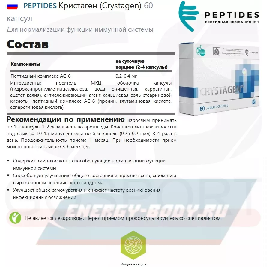 PEPTIDES Кристаген (Crystagen) 60 капсул — Нормализация функции иммунной системы