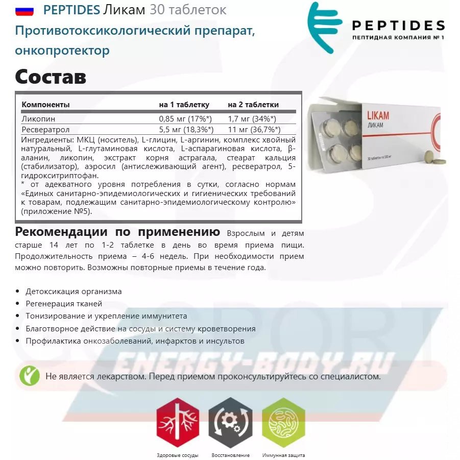 Ингредиенты: МКЦ (носитель), L-глицин, L-аргинин, комплекс хвойный натуральный, L-глутаминовая кислота, L-аспарагиновая кислота, β-аланин, ликопин, экстракт корня астрагала, стеарат кальция (стабилизатор), аэросил (антислеживающий агент), ресвератрол, 5-гидрокситриптофан.