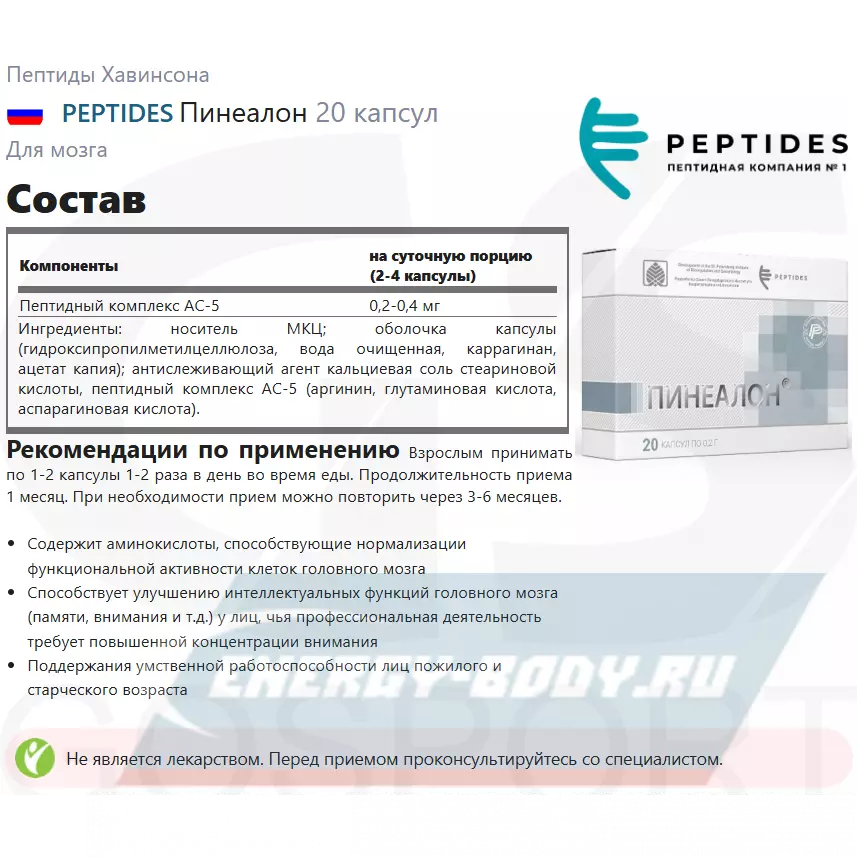 PEPTIDES Пинеалон (Pinealon) 20 капсул — Улучшение когнитивных функций и поддержка нервной системы