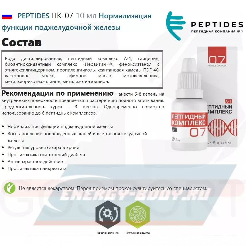 Для поддержки полноценной работы и предотвращения обменных нарушений поджелудочной железы был создан Пептидный комплекс в растворе № 7. Он содержит натуральный пептид поджелудочной железы (А-1), способствующий нормализации углеводного обмена при повышенной толерантности к глюкозе и сахарном диабете, а также улучшает синтез пищеварительных ферментов клетками поджелудочной железы. Также способствует нормализации процессов пищеварения (уменьшается вздутие, тяжесть в животе и другие симптомы внешнесекреторной недостаточности).